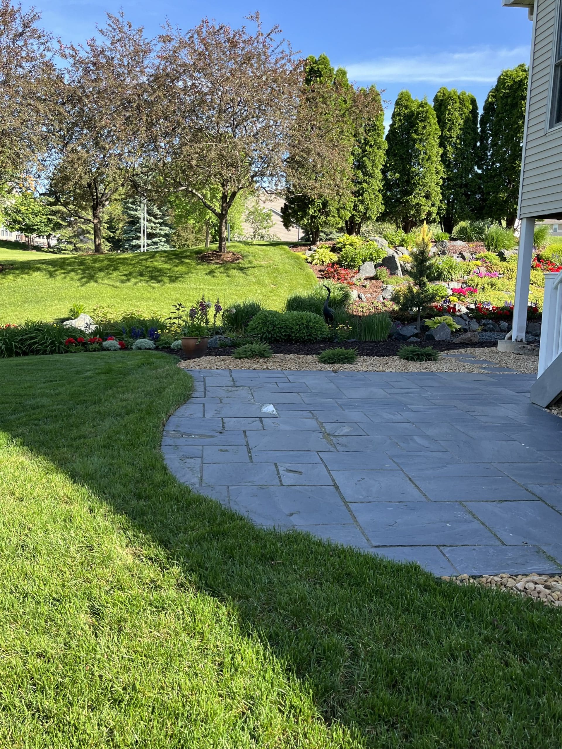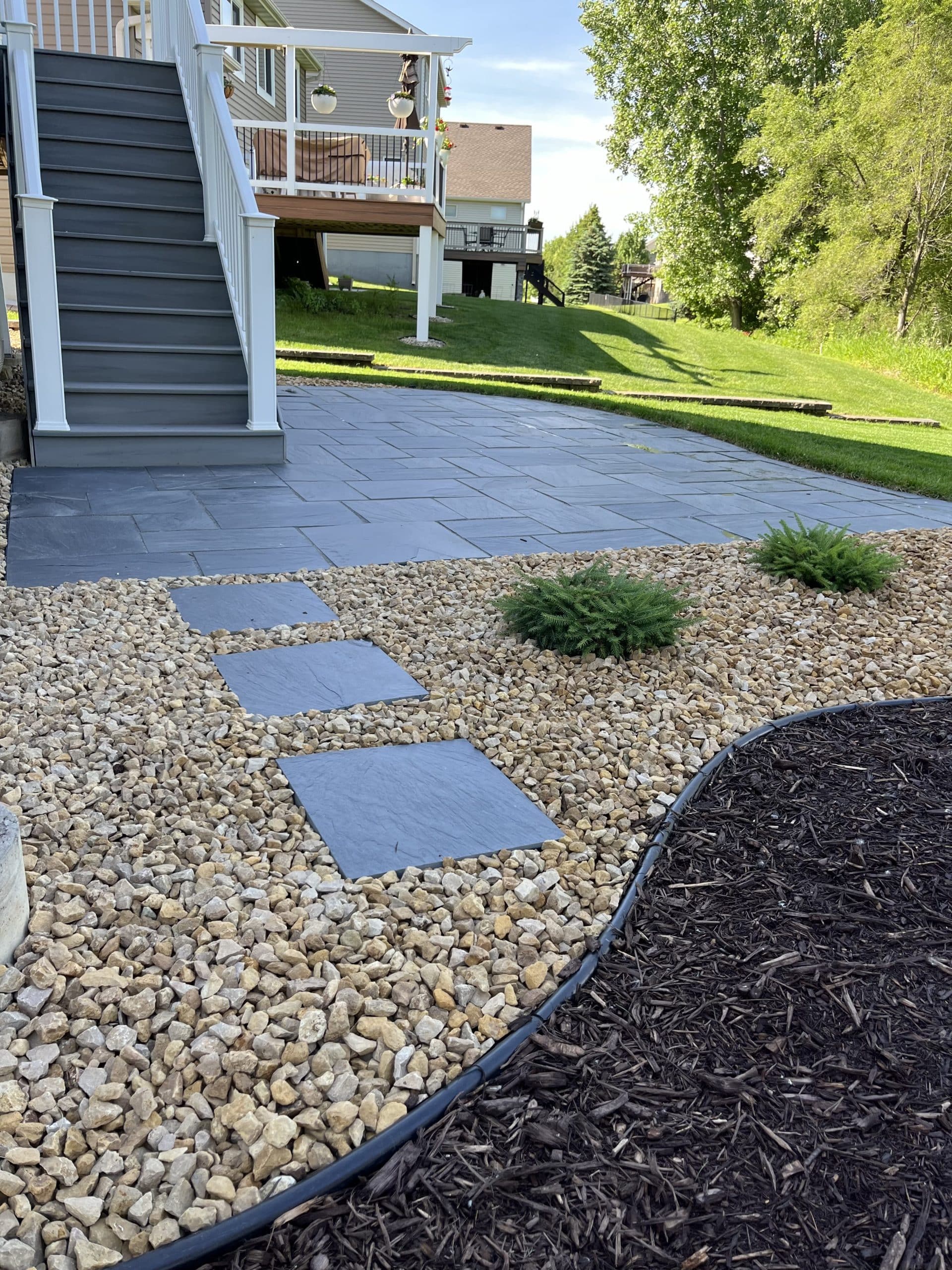 The project began with the removal of the old paver patio and various plantings around the home. Once that was done, our team installed a natural slate paver patio in the backyard and extended the slate pavers as stepping stones to the front of the home. This beautiful new addition allows the homeowner to access his backyard in an entirely new way.